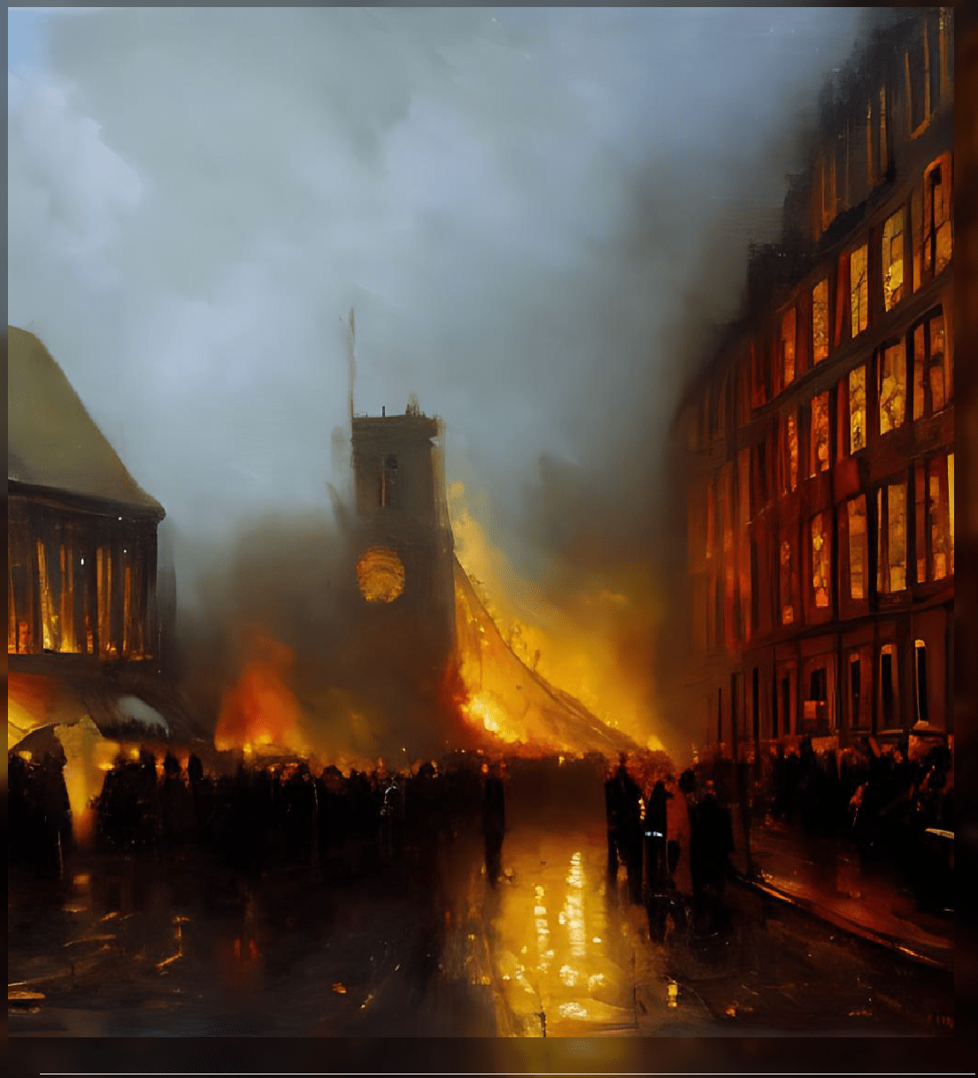 The Great Fire of London was a major conflagration that swept through the central parts of London, England, from September 2 to September 6, 1666. The fire started in a baker’s shop in Pudding Lane and quickly spread, fueled by the densely packed wooden buildings and strong winds. Despite the efforts of firefighters and volunteers, the fire raged for four days, destroying much of the city, including 87 churches, the Royal Exchange, and the Bridewell Palace.